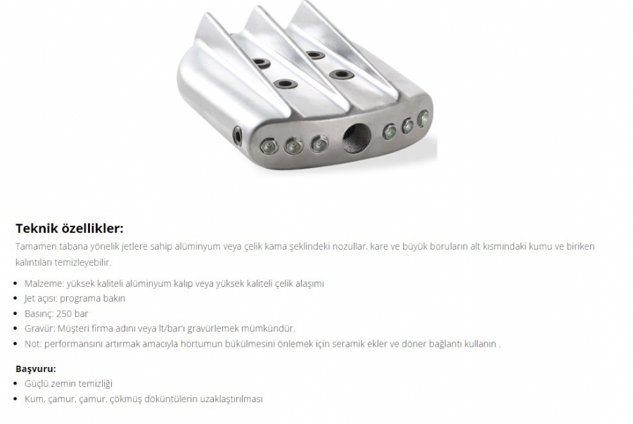 Tamamen tabana yönelik jetlere sahip alüminyum veya çelik kama şekilli nozullar, kare ve büyük boruların alt kısmındaki kumu ve biriken kalıntıları temizlenebilmektedir.